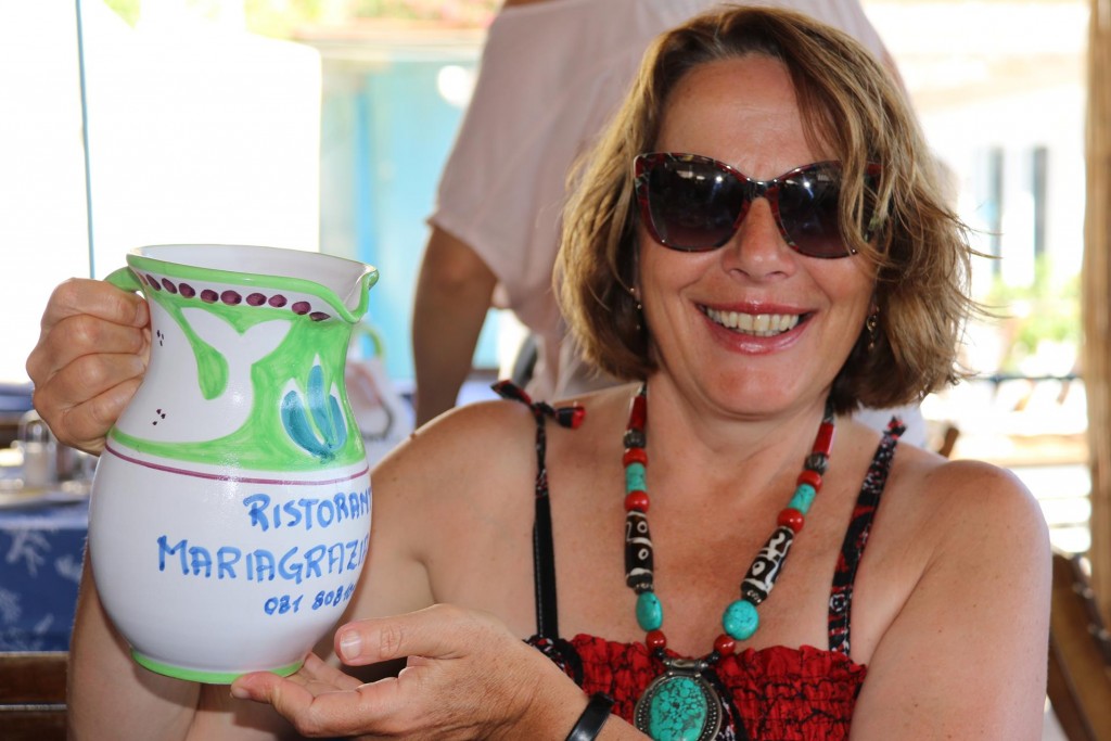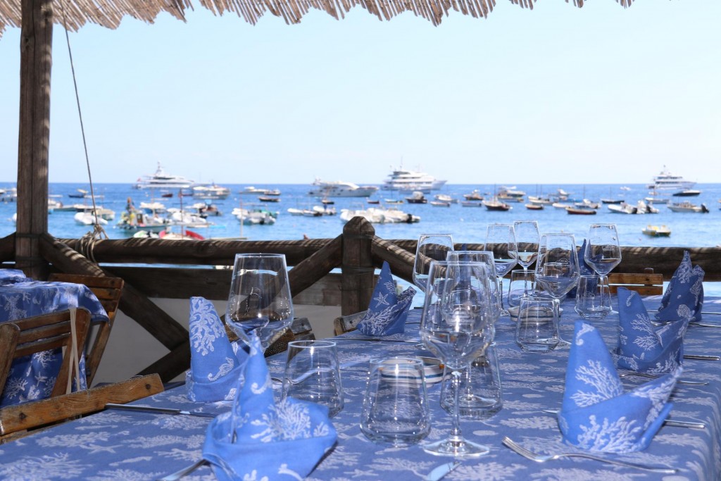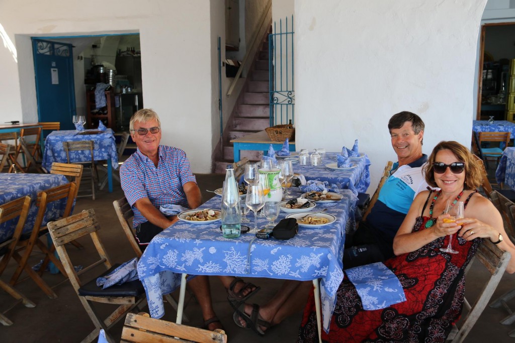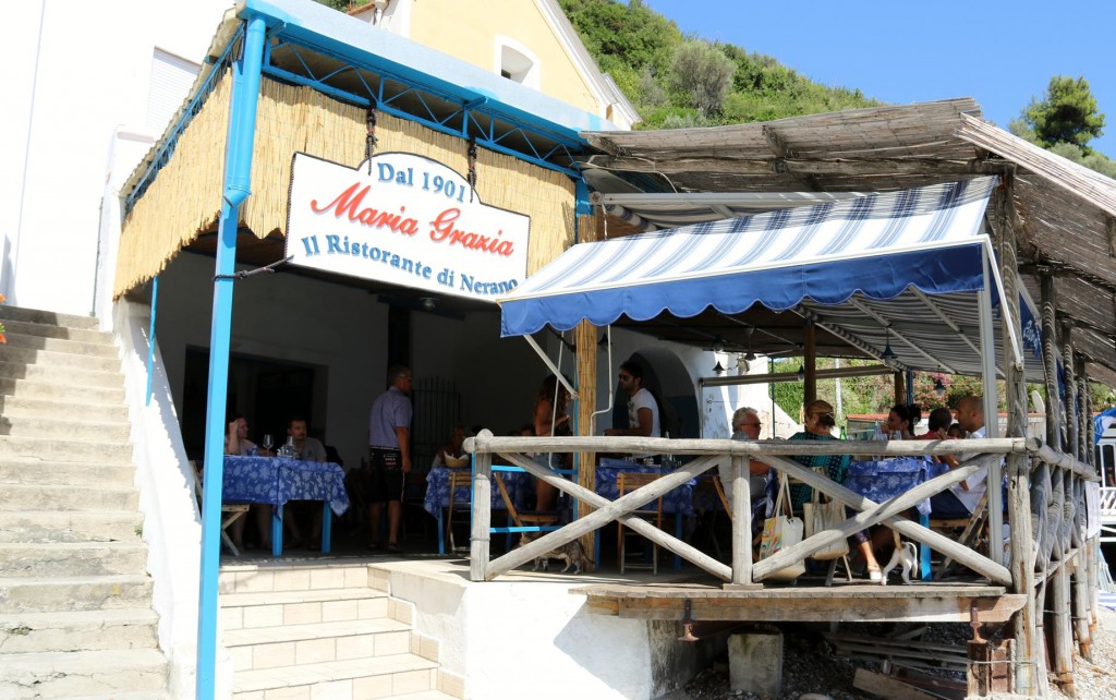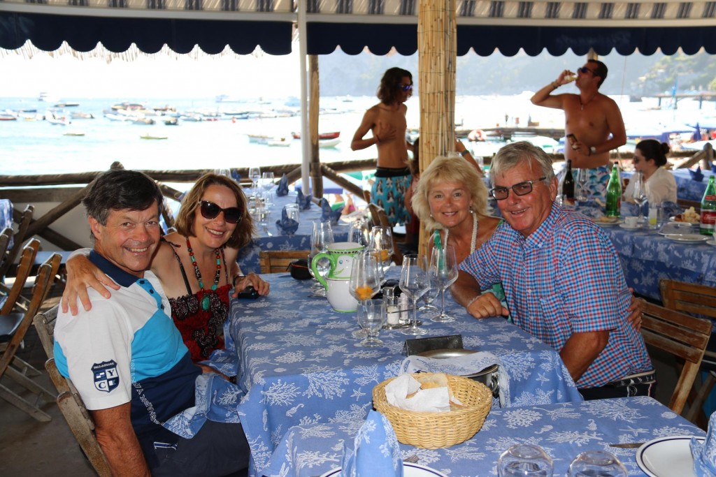 The wonderful restaurant, La Conca del Sogno which we visited last night for dinnerWe leave the mooring in Cala Punta di Sogno and move around the point to the next bayWe are keen to try the long established restaurant called Maria GraziaWe pick up one of the Maria Grazia restaurant buoys and make a late lunch booking in order to stay on the mooring overnightAt around 3 pm we are collected by the restaurant boat and taken ashore to the jettyThere are many families enjoying the lovely warm weather on the beach here by NeranoIt must still be siesta time for some peopleWe are looking forward to our late lunch at Maria Grazia which was established in 1901The view of hundreds of boats of all sizes in the bayTangaroa is in good company in the bay todayWe order a jug of the house speciality, white wine with peaches