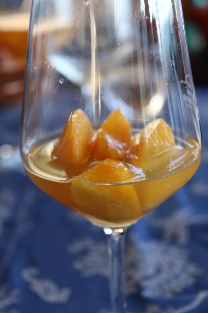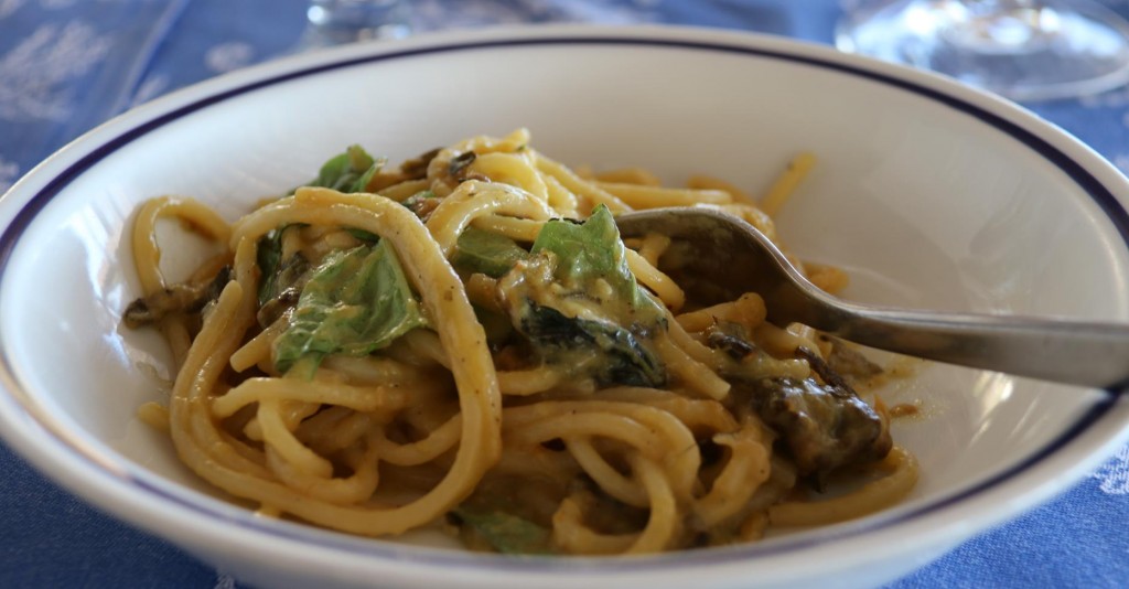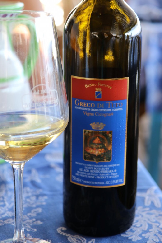 We try a nice chilled Italian vino biancoMaria Grazia’s house kitten makes itself comfortable between the tables