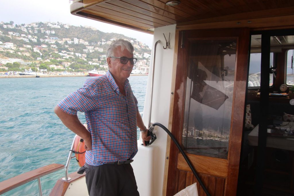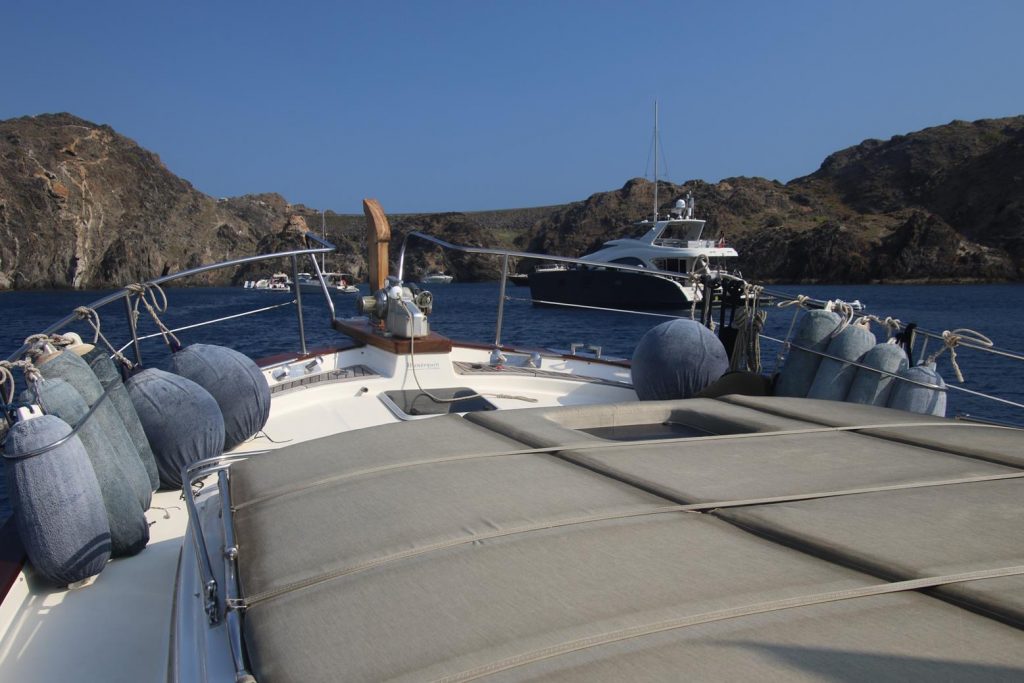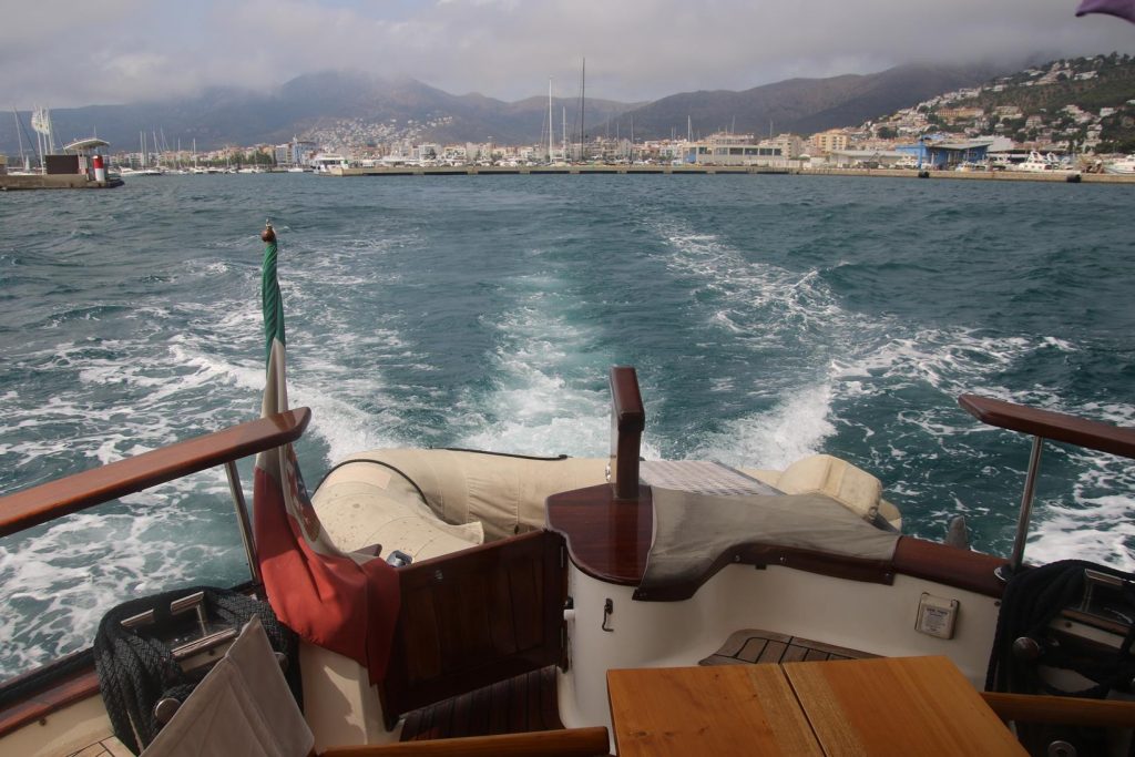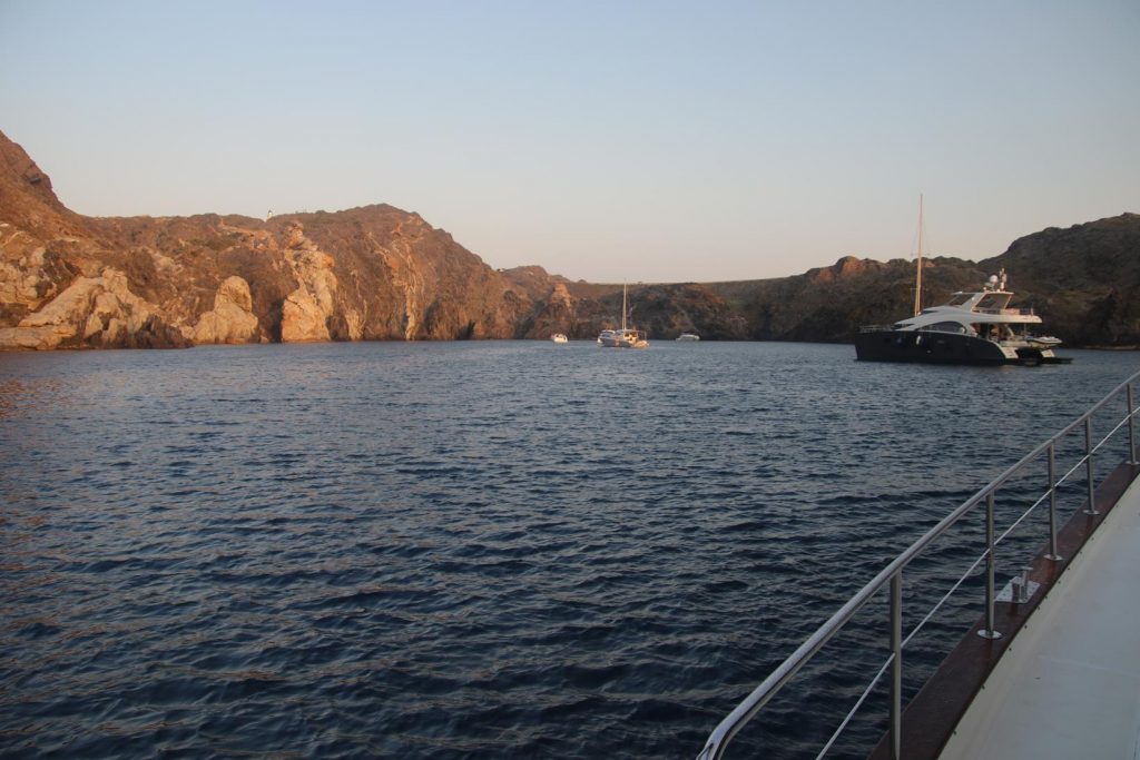 Early afternoon when the sea had settled somewhat, we pulled up our anchor and prepared to leave Puerto de Roses Before departing the bay we entered the marina to fill the fuel tanks of the Tangaroa Heading south east out of the bay before heading north up the coast, we continue our journey back towards the French coastWe still had a confused sea as we made our way up the coastApproaching Cap NorfeuWe pass Cadaques, one of the most beautiful towns on the north eastern Spanish coast Continuing north we head towards Cap de Creus By late afternoon we arrive at Cala Culip we decide to anchor for the nightThe quaint rocky beach at Cala Culip is one of Costa Brava’s most special virgin beachesIt wasn’t long before we were in the crystal clear warm water of the picturesque bayPlenty of fish below the surfaceAt sunset the cliffs glowed in the fading lightA simple pasta dish for dinner tonight