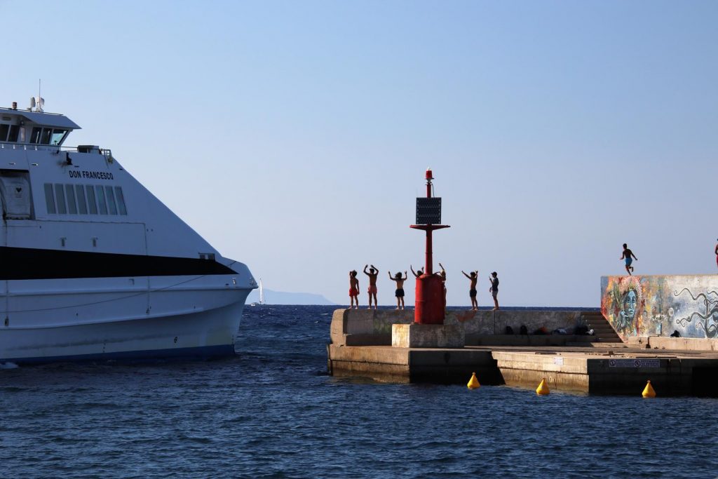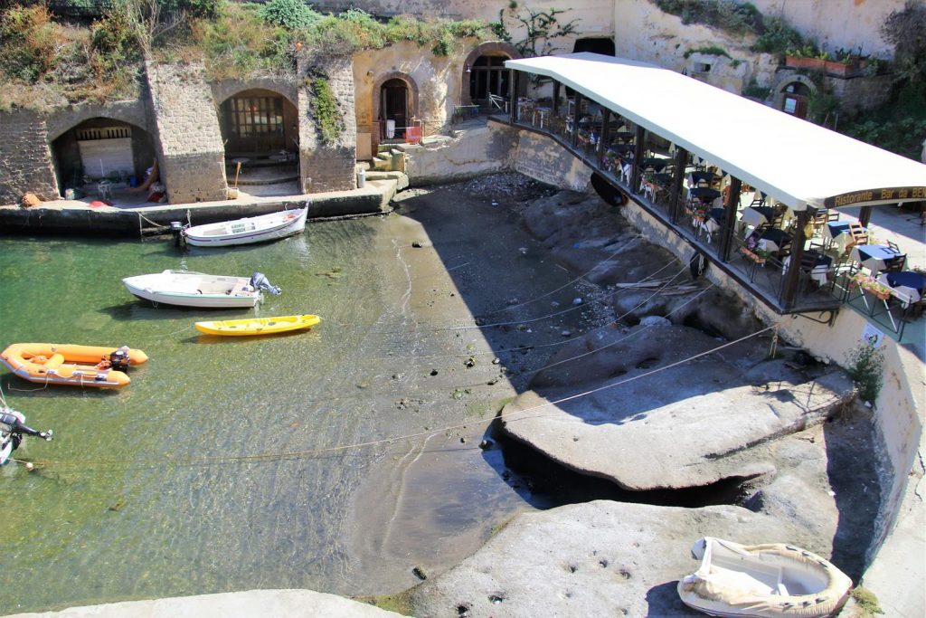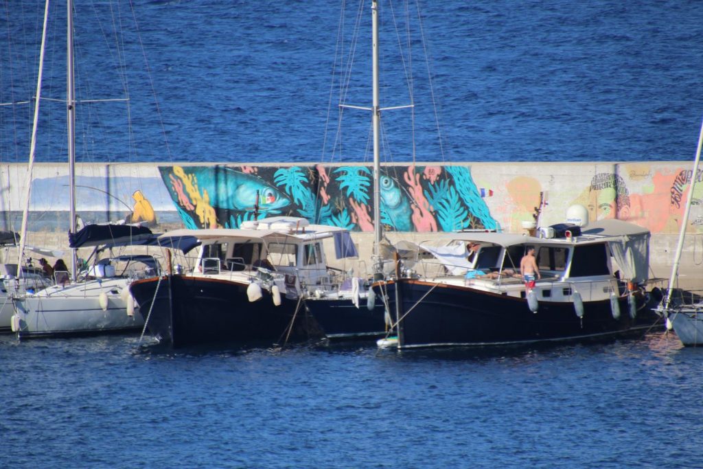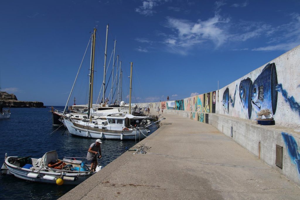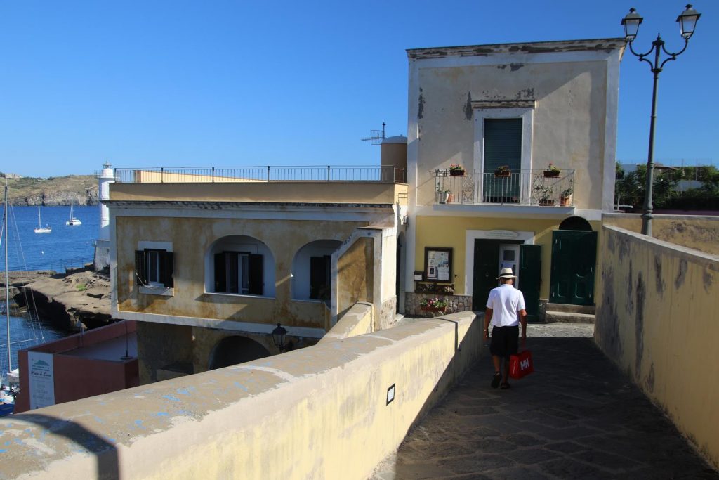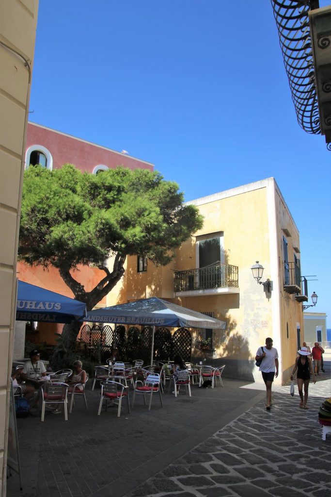 Not far from Ventotene Island is the small circular 400 m island of Santo Stefano which housed a prison for almost two centuries. The prison was built on 1797 and closed in 1965. Over the years it has housed many famous political prisonersContinuing on we try to book a table at La Terrazza di Mimi for this evening however they were booked out with a private functionThe scenery is spectacular overlooking the Cala Nave Beach and outlying isletsThere would be no free umbrellas today!!We check out another restaurant which again is booked out for dinner tonightThe Piazza Castello which houses the Ventotene Municipal BuildingWe circumnavigate the elevated town and arrive back overlooking the port where the Tangaroa is berthedWith the zoom lens we can easily see our family are back aboard and are enjoying the sun on the bow of the boatWe continue our walk around the lovely town coming to the churchBy the church is the zigzag ramp which leads you down to the port or visa versa takes you from the port to the upper townThe ancient man made portico of the old Roman port, has a series of arches behind which lie large storerooms. Today they are used as shops, bars and restaurantsReturning to the Tangaroa berthed in the larger main port with it’s wall of amazing graffiti The 5.30 pm ferry gets a friendly send off from several young onlookers