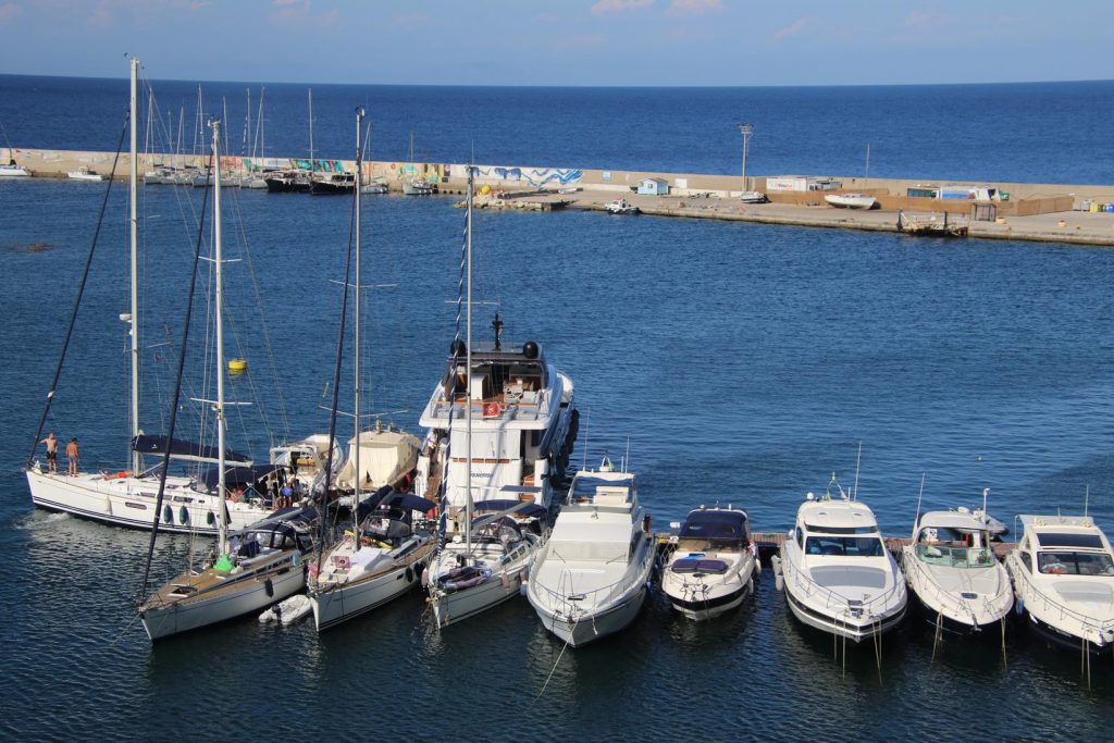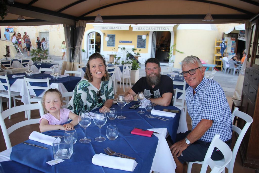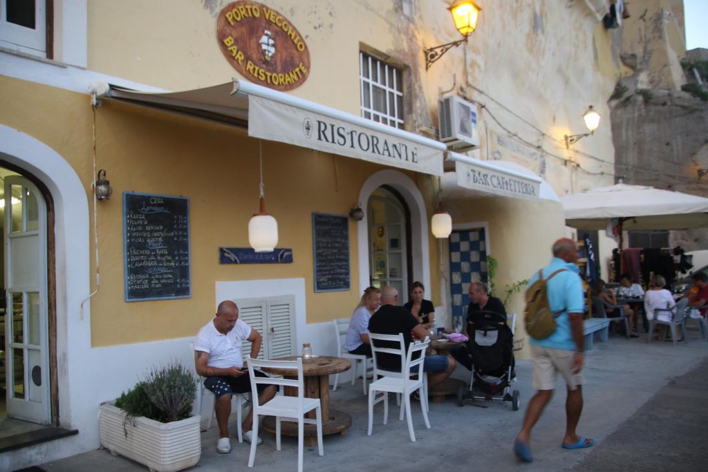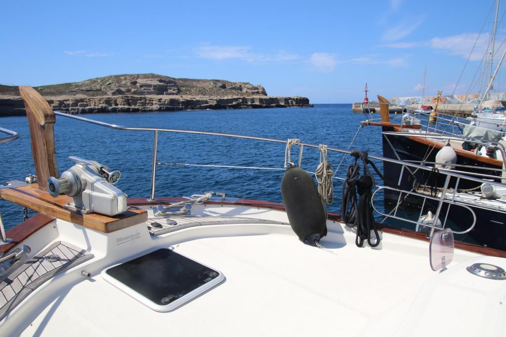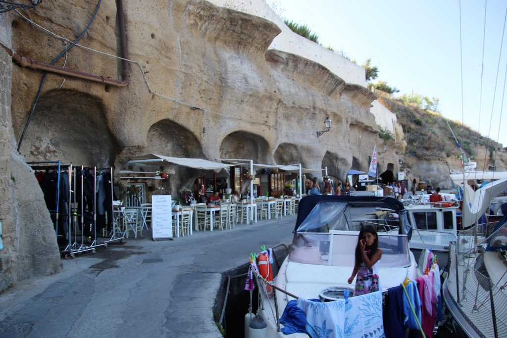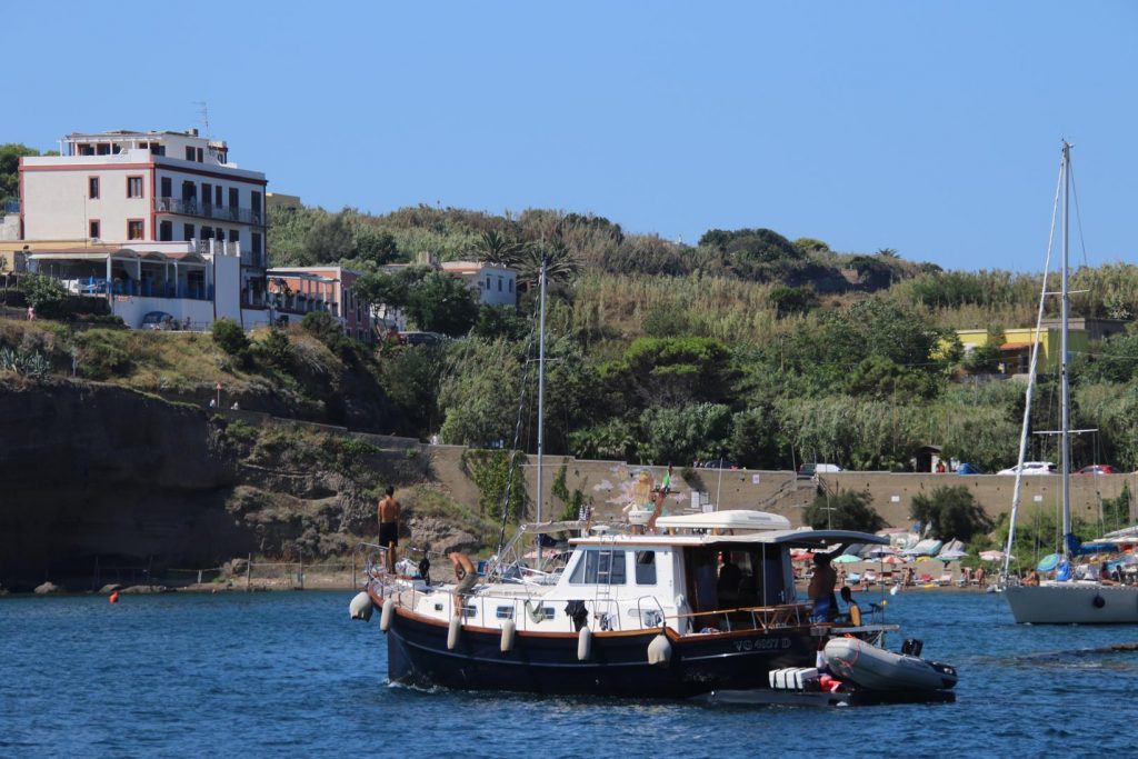 Early morning scenery in Cala Ferno, a very popular anchorage off Isola di Ponza Just after 7 am we pull up our anchor and continue our journey island hopping down the Italian west coastWe say goodbye to the lovely town of Ponza as we leave the island and head south east to our next destination, the small island of VentoteneAs we continue on, Isola di Ponza slowly fades into the distance During our 2.5 hour journey to Ventotene Island we pass the sister ship of the Tangaroa which we anchored close to on the first night at Isola di PonzaArriving at the island of Ventotene which is situated east of Isola di PonzaAs this is our second visit to Ventotene and we have our family with us, we decide to get a berth in the port rather than anchoring on the outsideA ferry arrives just after our arrival in the port ….. waiting for the ferry to tie up before we see what is availableSoon after we are safely tied up in a spot along the pier of the port, the other Menorquin arrives, also seeking a berthWith our assistance, our new acquaintances moor in a berth along the pier nearbyThe berths are limited along the port pier and it is the case of “first come first served”. The other option is booking and paying for a marina berth in the nearby marinaOur family decide to head off and take Betsey for a ride on her bike and a swim to get some relief from the very hot weatherA little later we also set off for a walk to again explore the lovely town and also to find a nice restaurant suitable for us all to go to dinner in the eveningBy the large main port is the ancient Roman Port, Porto Romano which was completely excavated out of the rock banks 2000 years ago. About 60,000 sq m of rock was removed to create the protected narrow port which is still in use today Nearby we come a across the family enjoying some nice cool drinksThe ancient port houses many of the small local boats The narrow entrance to the ancient port which smaller visiting yachts and motorboats can comfortably useWe continue our walk around the beautiful tiny town with it’s quaint paths and delightful shops and restaurants