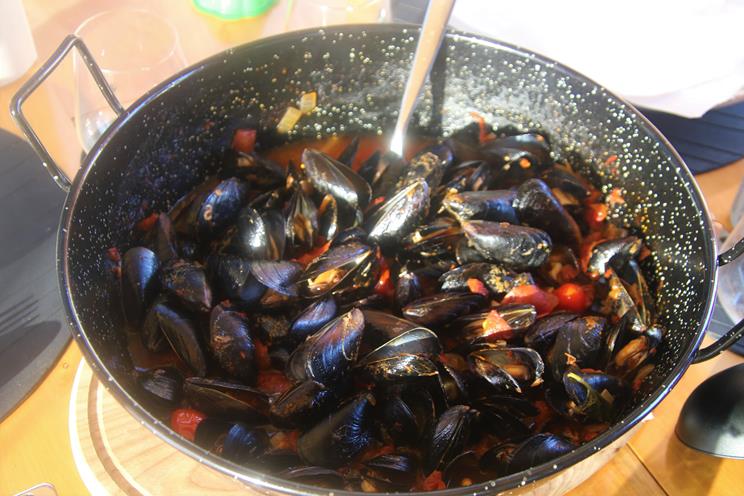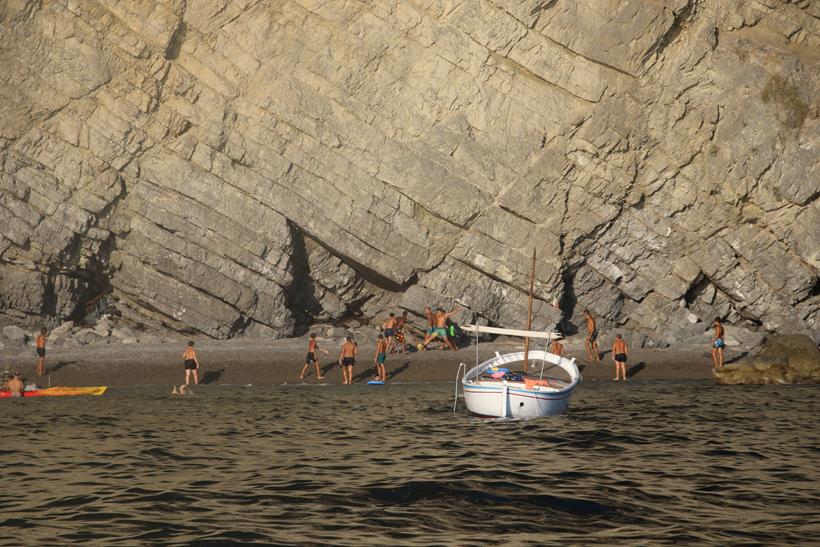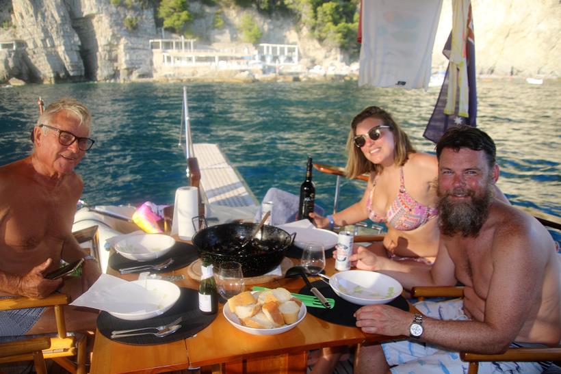 Betsey loves swimming in the beautiful warm and clear waterTime to restThe Grand Hotel Tritone has a lift to take house guests down to the waterfront and the small beach at the bottom of the massive cliffsThe guests may alternatively prefer to walk up the hundreds of steps to the hotelWe have some company anchored in the bayWith perfect conditions forecast we decide stay here on anchor overnightAnthony is the chef tonight cooking us some wonderful musselsThe mussels are cooked in a delicious chilli tomato sauceStill quite a few people on the nearby beachThe super yachts are lined up like soldiers off Positano !!Another fabulous Amalfi Coast sunset