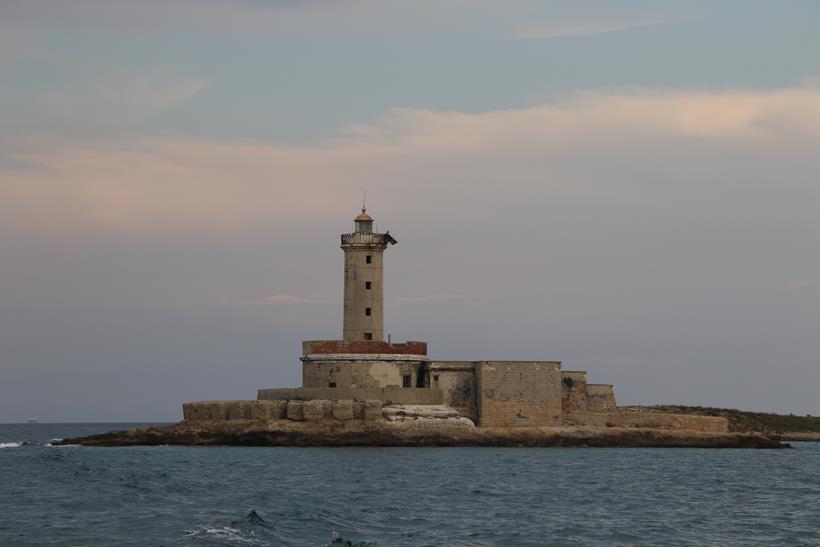Near the entrance to the Port of Brindisi is Isloa Taversa, the small island which is part of the Pedagne Islands. It has a lighthouse which is 18 m high with a range of 13 nautical miles and was built in the mid 1800’s
