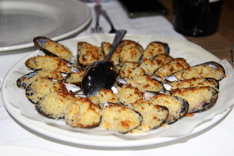 We order a plate of delicious grilled crumbed mussels