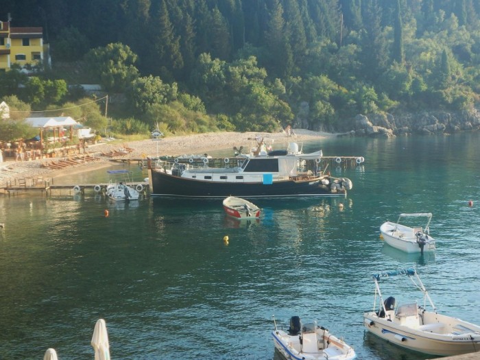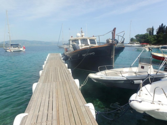 The boys tie up overnight at the Toula’s Restaurant pier, in Ormos Agni in the north east of Corfu Island